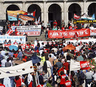 "Urbanismo caótico, infraestruturas de transporte irracionais, piscifactorías, campos de golf, portos deportivos, encoros, parques eólicos indiscriminados...", cita o manifesto da Rede Galiza Non se Vende. Adela Figueroa sinala que nesta manifestación Adega "focaliza a urxencia de derrogar o Plano Acuícola". A urbanización descontrolada da costa, os portos deportivos, Reganosa, a minaría a ceo aberto, o transporte por estradas e autovías... A presidenta de Adega enumera os puntos contra os que se erixe a asociación. "Queremos recuperar a nosa riqueza, por iso reclamamos un modelo de desenvolvemento sustentábel que se faga efectivo", apunta. Figueroa amósase a prol dun urbanismo "concentrado, unha cidade non difusa". A presidenta de Adega fai un chamamento á poboación, "sen participación cidadá, non hai desenvolvemento sustentábel".